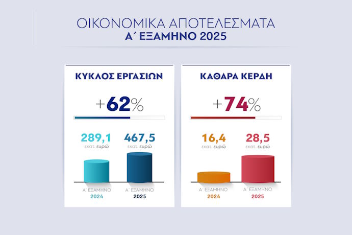 Τα οικονομικά αποτελέσματα Α’ εξαμήνου 2025  αποτυπώνουν τη στρατηγική του Ομίλου για συνέχιση της αναπτυξιακής πορείας του. Αναλυτικά, σύμφωνα με τις οικονομικές καταστάσεις για το α’ εξάμηνο του 2025, ο ενοποιημένος κύκλος εργασιών του Ομίλου αυξήθηκε κατά 61,7%, στα 467,5 εκατομμύρια, έναντι 289,1 εκατομμυρίων ευρώ πέρυσι. Τα κέρδη EBITDA ανήλθαν σε 70,1 εκατ. ευρώ στο α’ εξάμηνο του 2025 έναντι 54,2 εκατ. ευρώ το 2024.
