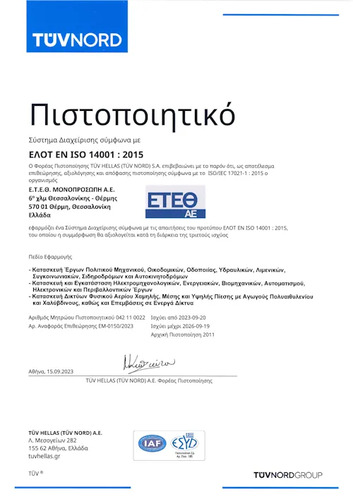Η Ε.Τ.Ε.Θ. Μονοπρόσωπη Α.Ε. θεωρεί ότι η προστασία του περιβάλλοντος είναι υποχρέωση όλων και δεσμεύεται να εφαρμόζει κάθε δυνατό μέτρο, διαδικασία, σύστημα για την ελαχιστοποίηση των αρνητικών περιβαλλοντικών επιπτώσεων και τη μεγιστοποίηση των αντίστοιχων θετικών.