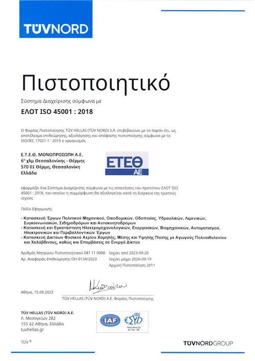 Η ΕΤΕΘ Μονοπρόσωπη Α.Ε. δεσμεύεται για: την παροχή ασφαλών και υγειών συνθηκών εργασίας και την πρόληψη εργατικών τραυματισμών και ασθενειών, την ικανοποίηση όλων των νομικών και άλλων απαιτήσεων θεμάτων Ασφάλειας και Υγείας, την εξάλειψη των κινδύνων και την μείωση της διακινδύνευσης, στο πλαίσιο των δραστηριοτήτων της, την συνεχή βελτίωσή της σε θέματα Ασφάλειας & Υγείας, την συμμετοχή και τη διαβούλευση των εργαζομένων στα θέματα Ασφάλεια & Υγείας, την οργάνωση σε θέματα Ασφάλειας & Υγείας με καθορισμό αρμοδιοτήτων και υποχρεώσεων σε όλη την ιεραρχία της Εταιρείας και την στελέχωση με το απαραίτητο ειδικευμένο προσωπικό, τον καθορισμό υποχρεώσεων Ασφάλειας & Υγείας για τους Υπεργολάβους της και την αξιολόγηση τους, την εκπαίδευση του προσωπικού της, τη θέσπιση στόχων σε θέματα Ασφάλειας & Υγείας, την συνεχή παρακολούθηση, ανάλυση και αξιολόγηση των επιδόσεων Ασφάλειας & Υγείας και την επιτυχή διαχείριση αλλαγών (κανονισμών, εξοπλισμού, εγκαταστάσεων, κλπ) που επηρεάζουν τα θέματα Ασφάλειας & Υγείας.