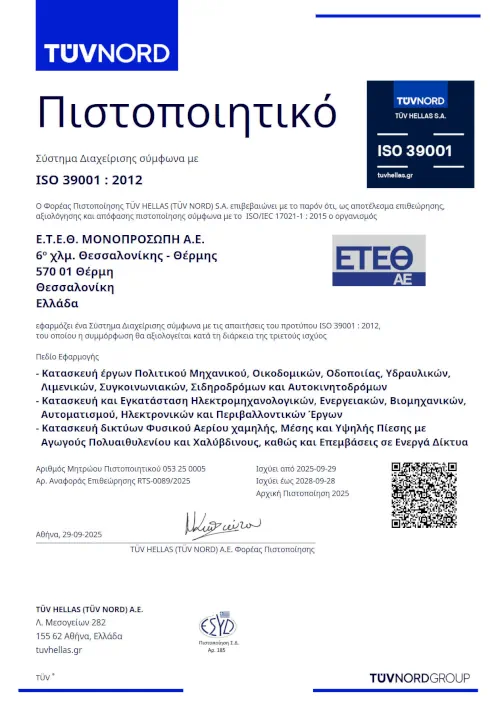 Δέσμευση της εταιρείας είναι η παροχή ασφαλών συνθηκών εργασίας και οδήγησης και η πρόληψη τραυματισμών και ατυχημάτων, η ικανοποίηση όλων των νομικών και άλλων απαιτήσεων θεμάτων Οδικής Ασφάλειας, ο αποτελεσματικός και συστηματικός έλεγχος / συντήρηση όλων των οχημάτων της, η μείωση των επιπτώσεων των οχημάτων της στο περιβάλλον, η εξάλειψη των κινδύνων και η μείωση της διακινδύνευσης στο πλαίσιο των δραστηριοτήτων της, η συνεχής βελτίωσή της σε θέματα Οδικής Ασφάλειας, η συμμετοχή και η διαβούλευση των εργαζομένων της στα θέματα Οδικής Ασφάλειας, η οργάνωση σε θέματα Οδικής Ασφάλειας με καθορισμό αρμοδιοτήτων και υποχρεώσεων σε όλη την ιεραρχία της Εταιρείας και την στελέχωση με το απαραίτητο ειδικευμένο προσωπικό, ο καθορισμός υποχρεώσεων Οδικής Ασφάλειας για τους Υπεργολάβους της και η αξιολόγηση τους, η εκπαίδευση του προσωπικού της, η θέσπιση στόχων σε θέματα Οδικής Ασφάλειας, η συνεχής παρακολούθηση, ανάλυση και αξιολόγηση των επιδόσεων Οδικής Ασφάλειας. Η Ε.Τ.Ε.Θ. Μονοπρόσωπη Α.Ε. υποστηρίζεται στην προσπάθειά της αυτή από το Τμήμα Διαχείρισης Ποιότητας, Ασφάλειας & Υγείας και Περιβάλλοντος.